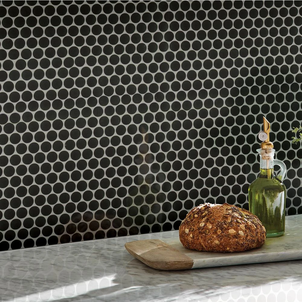 MSI’s Penny Round Nero Porcelain Mosaic Tiles are retro with a refreshing modern edge. Their timeless shape and bright black color make them exceedingly versatile – complementing traditional to contemporary design styles. Pair them with large format porcelain tiles for a style-savvy cohesive look or use them alone to add detail and interest to residential floors, walls, counters or backsplashes. The choice is yours and the possibilities are endless. Incredibly durable and easy to care for, this low sheen tile is also recommended for some light commercial and heavy commercial applications, including walls and backsplash. Tiles are prearranged on mesh-backed sheets for simplified installation.